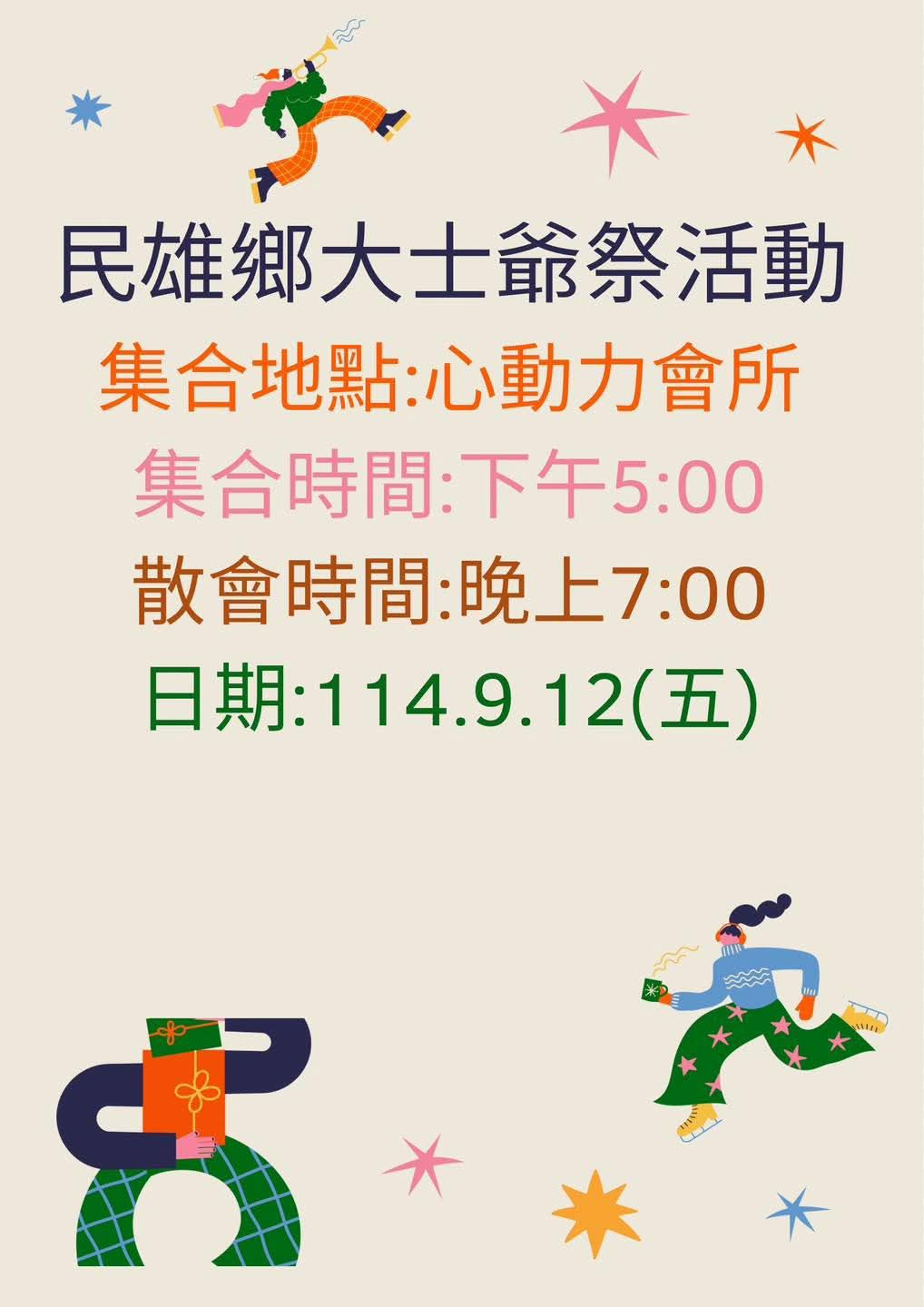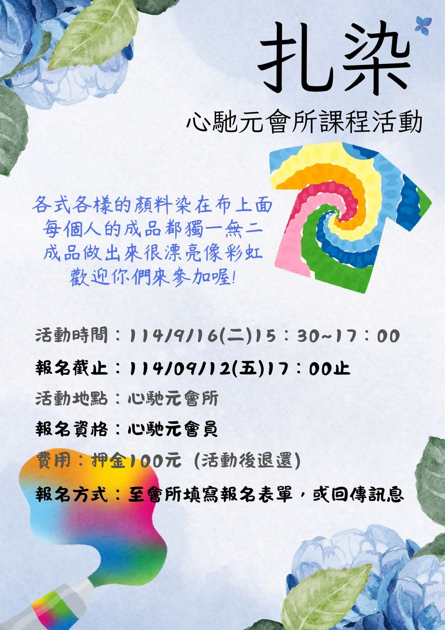 活動報導 協作模式服務據點與精神障礙者就業 社區居住與生活 嚴重情緒行為正向支持服務 布建身心障礙者社區式日間照顧服務 同儕支持課程與活動 精神疾病家屬支持服務 復康足球 多元球類與體適能運動課程 復元故事 會員大會 捐款相關 其他 2025-09-01 ~ 2025-09-30 心馳元會所 心馳元會所: 心、奔馳、復元 2025-09-01 ~ 2025-09-30 心動力會所 心動力會所:從心出發,帶著動力一起前行 2025-09-01 ~ 2025-09-12 【心動力會所】--大士爺活動 2025-09-01 ~ 2025-09-16 【心馳元會所】--扎染 2025-07-01 ~ 2025-07-31 心旅程會所 🌿 心旅程會所:一起走出心靈的旅程 2023-12-09 『軌跡.1070520.一個人走快 一群人走遠』 心旅程會所 第二屆成果展 112年12月9日(六)10:00-12:00 2023-11-25 心動不如馬上行動 心動力會所 成立一周年成果展 112年11月25日(六)10:00-16:00