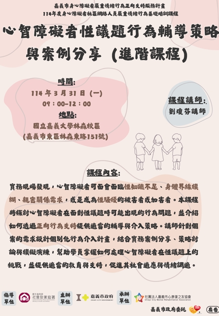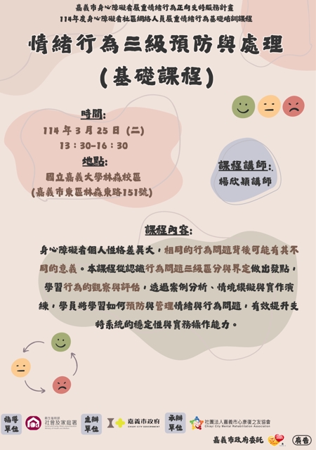 2025-02-01 ~ 2025-03-31 嚴重情緒行為正向支持服務 嚴重情緒行為正向支持服務 ~ 114年度3月份 培訓課程開跑囉!! 行為輔導團隊將於 三月辦理培訓課程 歡迎踴躍報名參加!! 回上一頁