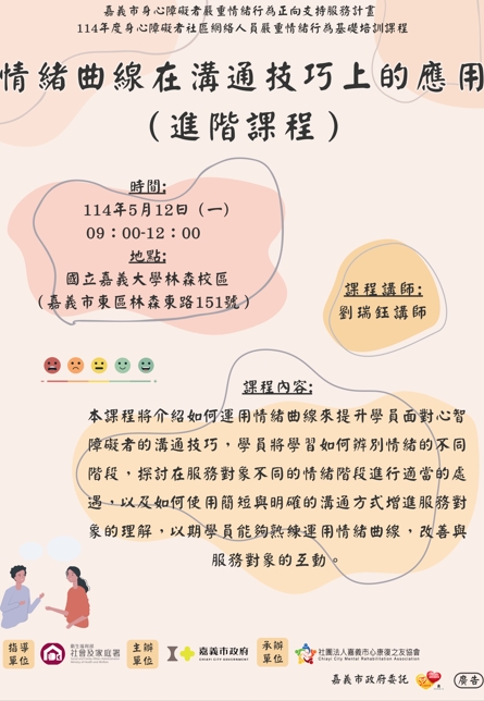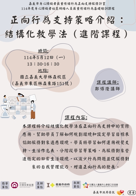 2025-04-01 ~ 2025-05-31 嚴重情緒行為正向支持服務 嚴重情緒行為正向支持服務 ~ 114年度5月份 培訓課程開跑囉!! 行為輔導團隊將於 五月 辦理培訓課程 歡迎踴躍報名參加!! 回上一頁